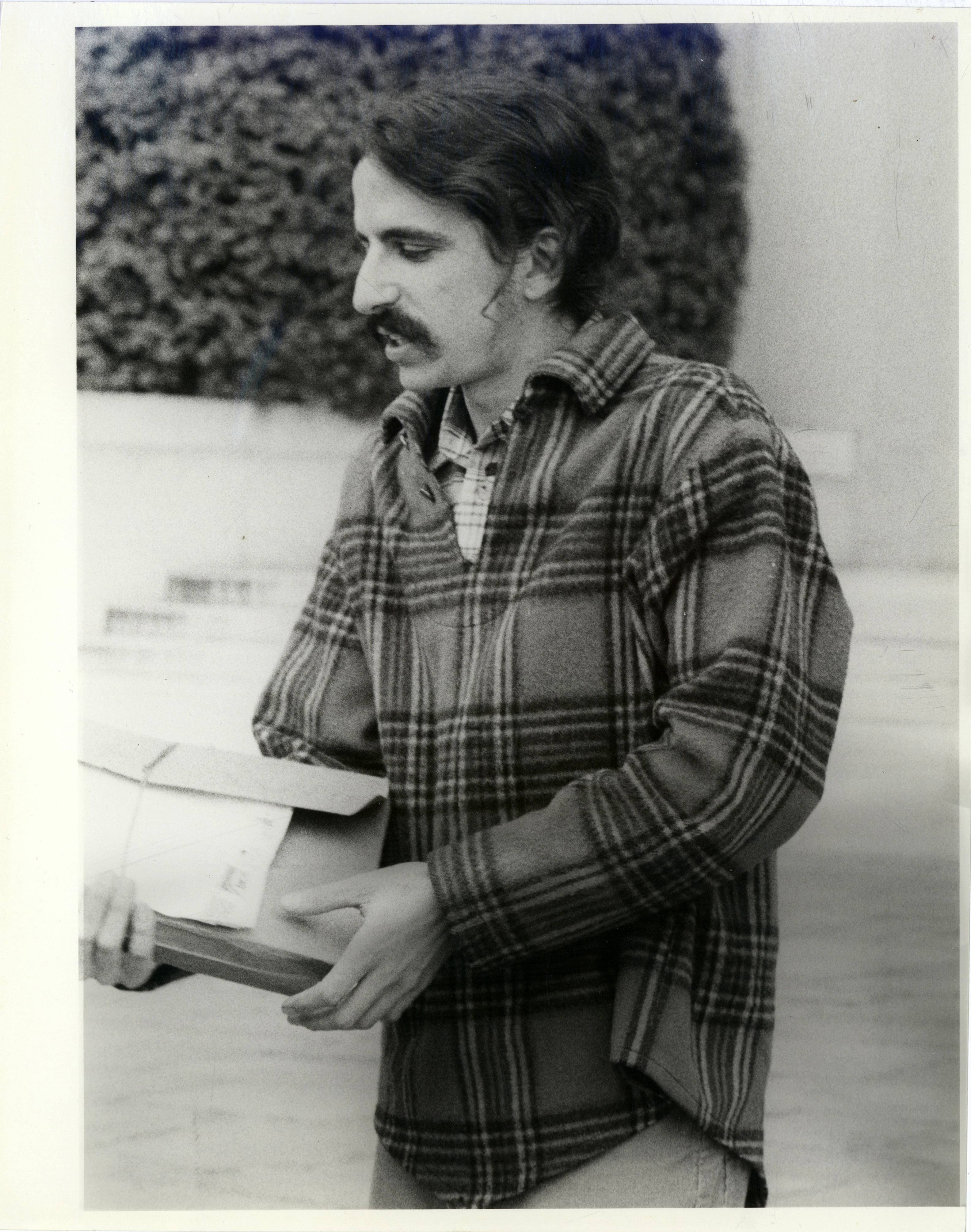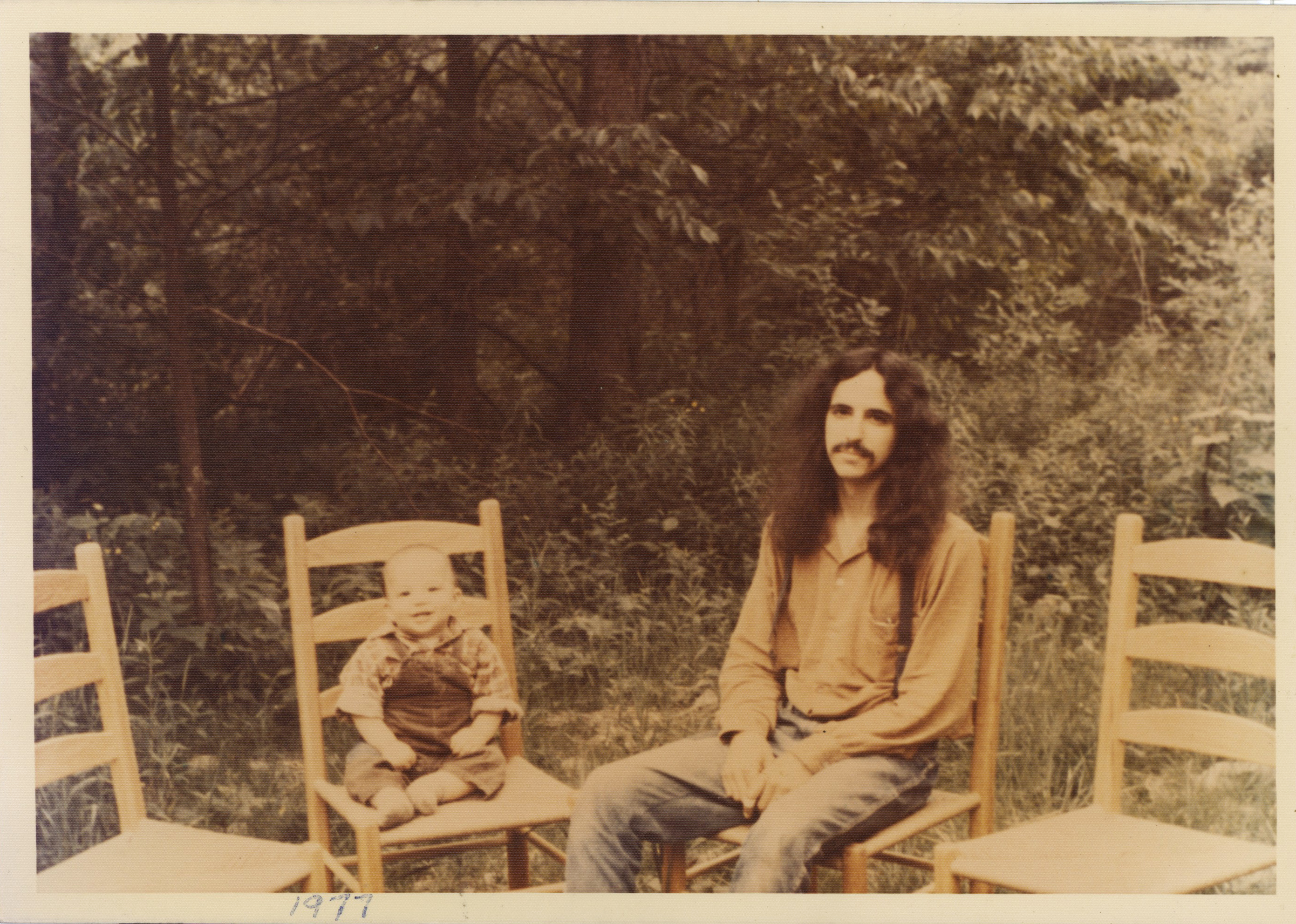 Jesse (in his first year) and me, getting ready to deliver a dining set I made for a client, 1976, Hubbard Hill Commune, Candor, New York |